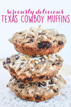 These Texas Cowboy Muffins are filled with loads of deliciousness... chocolate chips, coconut and raisin. Throw in a dash of cinnamon and enjoy!