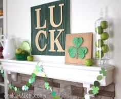 St Patricks Mantel featuring a gold and green "LUCK" sign, shamrock string art, paint chip garland and lots of green accessories.