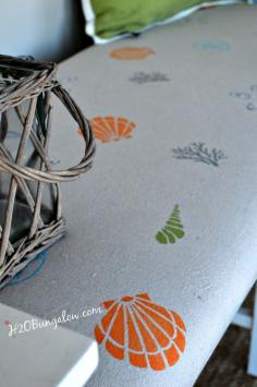 My stenciled coastal bench makeover is fresh and ready for a new place in our home. Perfect for a dining banquette, end of the bed or seating for friends. #furniture #paintedfurniture #Coastalfurniture H2OBungalow.com