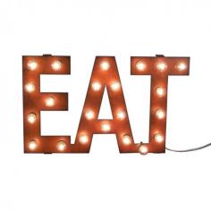 This Eat Marquee Vintage-Style Sign gives any space some much-needed illumination and an industrial vintage vibe. Made of rusted recycled metal and lit with small 5-watt bulbs.