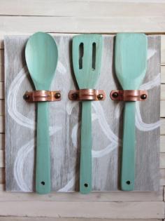Make unique art for your kitchen with copper pipe straps and wooden utensils!