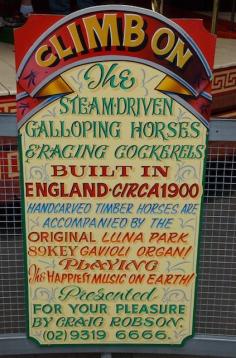 Luna Park Gallopers Sydney Luna Park Carousel Sign © Victor Hugo Date of picture: December 09, 2007 - This carousel called Commander Baldocks Galloping Horses and Racing Cockerels Carousel was constructed in the late nineteenth century. The carousel was brought to Australia in the early 1990s by Craig Robson. It was restored and modernized over a five-year period.