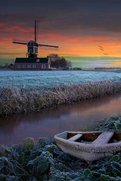 Frosty field and windmill at sunrise, The Netherlands (by Wim Lassche on 500px)