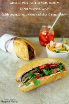 Grilled Portabella Mushroom Banh Mi Sandwich {with yogurt-garlic aioli, pickled red radishes and fresh vegetables}. An easy, healthy, colorful and delicious alternative to the traditional Vietnamese banh mi sandwich. Perfect for Lenten meals. #happyandharried #banhmi #sandwich #Vietnamese #Asian #grilled #portabella #portobello #mushroom #pickled #vegetables #radish #cilantro #yogurt #aioli #lowfat #skinny