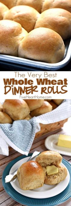 Homemade Whole Wheat Dinner Rolls ~ adapted from our incredibly popular Homemade Whole Wheat Bread recipe, these 100% whole wheat dinner rolls are soft, pillowy, moist, easy to make, and truly the BEST! | FiveHeartHome.com