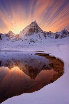 The northern lights and beautiful landscapes in Sweden and Norway - Rays of sunlight streak over a snowy peak reflected in a lake in Lofoten Islands, Norway