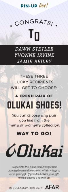 Yahoo! This week's three lucky recipients will receive any pair of OluKai shoes that they choose! woohoo and congrats to Jamie Reiley, Dawn Stetler and Yvonne Irvine! Contact us today to claim your gift.