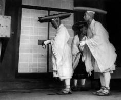 Pilgrims in traditional dresses prepare to climbing up Mt. Hiei, near Kyoto, 1951 by Werner Bischof