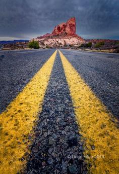 Road view towards a large monolith in Arches National Park, Utah