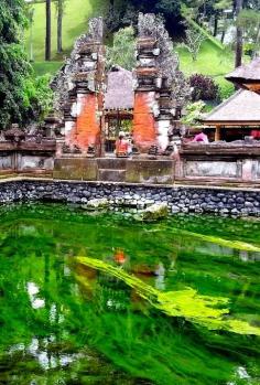 Vibrant green algae seen outside the Holy Water Temple in Bali, Indonesia
