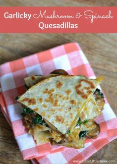 Treat yourself to these Garlicky Mushroom and Spinach Quesadillas! They're the perfect treat for Cinco de Mayo or any occassion! | Hello Little Home #Mexican #Vegetarian #CincodeMayo