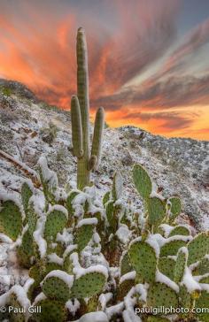 saguaro and prickly pear cactus covered in snow, Apache Trail, Superstition Wilderness Area, Arizona