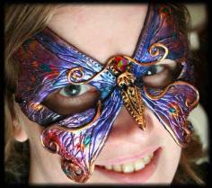 PURPLE AND GOLD BUTTERFLY MASK This swallowtail butterfly mask is iridescent purple, blue and gold highlights. A red gem with rainbow sheen forms the butterfly's head. This mask is entirely hand sculpted and hand painted with an artist's stamp at the back. Roughly 6" wide by 5.5" tall. - Unique Personalized Masks by Namingway | Art and Design