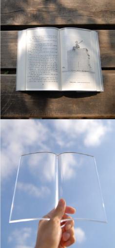 A transparent acrylic paper weight to hold down the pages of a book as you eat and drink while reading.