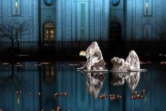 Salt Lake City's Temple Square, Mirror Pool with lights and nativity.