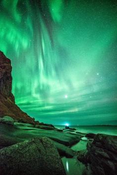 The northern lights at Uttakleiv beach at Lofoten island, Norway