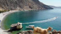 Glyka Nera beach (=sweet water), Taverna Mermaid Island, Crete Greece, Kreta, beetween Chora Sfakion and Loutro, 30/60 min walk or by boat.