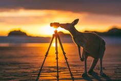 Bridget the Kangaroo taking her photography to the next level at this morning's sunrise on Casuarina Beach Discovered by Matt Glastonbury at Cape Hillsborough, Australia