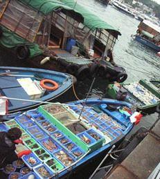 Selling fresh seafood from the boats at Sai Kung fishermen port, in Hong Kong