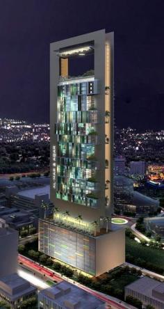 Atkins Design : Al Sharq office complex, Bahrain __ The 180m tower will cover an area of 56,400sq.m. Commissioned by Al Mar & Aqar, the complex combines work and leisure, internal and outside spaces, and offers a variety of scenarios for business within a sustainable and environmentally responsible design. Hovering above a glass fronted entrance is a podium with a sky garden food court. Office spaces are hung from a pairing of parallel blades topped at roof level with a gym, health club and pool