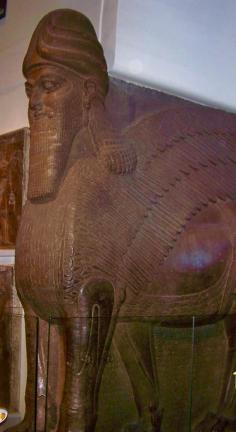 One of a pair of winged human-headed bulls that guarded the gateway of an Assyrian palace in Nimrud, what is now Iraq - British Museum,London