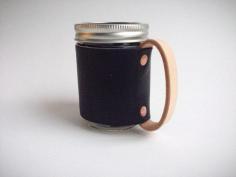 Black leather mason jar koozie. Travel mug with handle