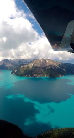 Riding Harbour Air Seaplanes' Ultimate Glacier tour in Whistler. We got to soar above the clouds over mountains, glaciers, lakes and more. This is Garibaldi Lake via Round The World Girl