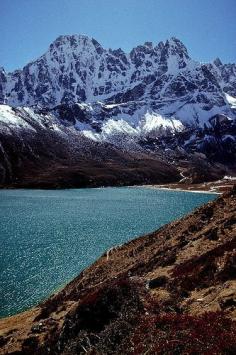 Dragon's Peak looms above Milk Lake in the Himalayas, Gokyo, Nepal.