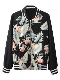 Black,Bomber,Jacket,With Leaf Print