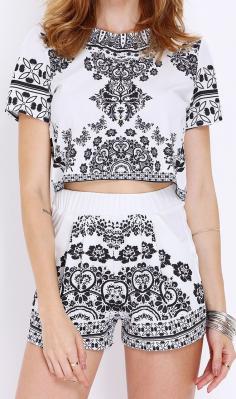 White Short Sleeve Vintage Print Top With Shorts