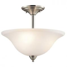 Elegant transitional-style ceiling light. Constructed of steel in a variety of finishes. Bowl-shaped satin etched glass shade. Accommodates (3) 100W medium base bulbs (not included). Overall dimensions: 16W x 13.25H inches. Make your favorite room more cozy and welcoming, with the Kichler Nicholson 42879 Semi-Flush - 16 in. Simple in design, this lighting accessory maybe what your modern home needs. Minimally adorned, it features a sleek steel frame that's covered in an attractive finish. Apart from looks, this three-bulb lighting accessory is perfect for illuminating hallways or bedrooms. Its elegant diffuser, made of etched glass, suffuses your space with brilliant radiance. Kichler QualitySince 1938, Cleveland-based Kichler Lighting has been known for their innovative designs and excellent craftsmanship. Kichler is the world's leading decorative lighting fixture company and the winner of four ARTS Lighting Manufacturer of the Year awards. Kichler designers travel the world to discover the latest trends in exterior and interior style, colors, and designs. They then translate the best of those trends into fixtures that will bring beauty, pleasure, and light into your home. Kichler fixtures stand the test of time and are functional works of art that you're sure to treasure. Color: Brushed Nickel.