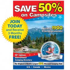 Nearly 1900 campgrounds across the US, Canada, and Mexico are currently participating in the Passport America Program, with new parks joining daily. Although our concept has often been imitated Passport America is still the best value, lowest price, and the World's Largest network of Quality Campgrounds of its kind. With the Passport America membership, members also receive a FREE subscription to RV America magazine. This magazine provides a fresh look within the RV Industry and provides our members with many great features such as Product Highlights, and Recipes from the Road. It also provides members with updates to the current edition of the Passport America International Camping Directory. Good Sam Club members join today and receive 3 months FREE, plus enjoy these benefits: The all-new annual International Camping Directory with over 1,800 campgrounds Personalized 50% Discount Travel CardFree online edition of the RV America magazine published four times a year with travel features and more Free Trip Routing, online campground search 24/7 at passportamerica.com Free lifetime email address and service at: [email protected] Economical rates on MyRVmail.com, Passport America's mail forwarding service Additional member benefits and savings on RV related services Offer available to new enrollments through Camping World channels only.