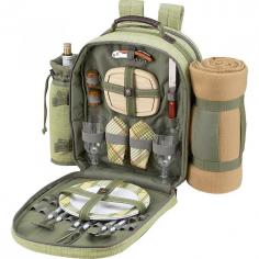 Made of designer cotton tweed fabric with canvas accents Olive green color Features adjustable shoulder strap for comfort Comes with insulated detachable wine pouch Includes blanket fork cutting board knife etc. Dimensions: 22W x 6.5D x 15.5H in. Combination of cotton tweed and canvas gives the Picnic At Ascot Hamptons Backpack with Picnic Blanket for 2 - Olive Green a sophisticated appeal. This backpack designed in the U.S.A. includes all essentials for a fun picnic like a corkscrew hardwood cutting board with juice groove cheese knife wooden salt and pepper shakers with non-spill tops acrylic wine glasses melamine plates stainless steel flatware cotton napkins and a fleece blanket. Because it has Thermal Shield insulation this bag keeps food or drinks at a desired temperature. The soft fleece blanket in a detachable case makes any outing more intimate. Its ergonomic design with comfortable straps makes carrying it on trips easier. About Picnic at AscotDay or evening beachside or backyard picnics are a favorite event. By introducing Americans to the British tradition of upmarket picnics over a decade ago Picnic at Ascot created a niche for picnic products combining British sophistication with an American fervor for excitement and exploration. Known as an industry leader in the outdoor gift market Picnic at Ascot houses a design staff dedicated to preserving the prized designs and premium craftsmanship signature to the company. Their exclusive products are carried only by selective merchants. Picnic at Ascot provides quality products that meet the demands of today yet reflect classic picnic style.