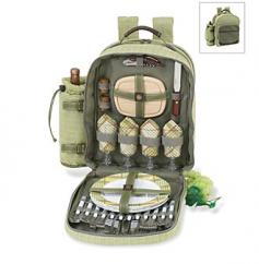 Designer cotton tweed fabric with canvas accents Olive Green color Spacious extra front storage compartment Come with insulated detachable wine pouch Dimensions: 16W x 6.5D x 15.5H in. Add to the experience of a picnic amid friends or family with the Picnic At Ascot Hamptons Picnic Backpack for 4 - Olive Green. This designed-in-the-U.S.A. bag has a durable cotton tweed and canvas construction. As it has Thermal Shield insulation this backpack keeps food or drinks at a desired temperature. An ergonomic design with comfortable straps makes carrying it on trips easier. Among its contents are necessities like a removable wine pocket stainless steel cutlery melamine plates non-spill salt-n-pepper shakers and cotton napkins. About Picnic at AscotDay or evening beachside or backyard picnics are a favorite event. By introducing Americans to the British tradition of upmarket picnics over a decade ago Picnic at Ascot created a niche for picnic products combining British sophistication with an American fervor for excitement and exploration. Known as an industry leader in the outdoor gift market Picnic at Ascot houses a design staff dedicated to preserving the prized designs and premium craftsmanship signature to the company. Their exclusive products are carried only by selective merchants. Picnic at Ascot provides quality products that meet the demands of today yet reflect classic picnic style.