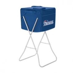 New England Patriots party cooler with stand. This Patriots cooler is the lightweight, soft-sided portable party cooler that comes with a removable, collapsible stand so your drinks and/or snacks are accessible at a comfortable height. It comes with a removable, water-resistant interior divider that allows you to divide the cooler into two sections, each with its own access. Separate food from drinks or beverages by type. In the event there's no shade, you can insert a standard sized umbrella (not included) into the integrated slot to keep the cooler out of the sun. This cooler and stand can be used for backyard parties or as a refreshment stand at your child's soccer games. All licensed products have been approved by the team; however, Picnic Time is considered a designer line. The product color may not be an exact match to the team color.