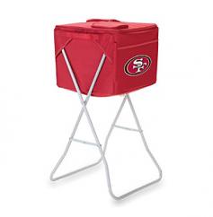 $ 85 San Francisco 49ers party cooler with stand. This 49ers cooler is the lightweight, soft-sided portable party cooler that comes with a removable, collapsible stand so your drinks and/or snacks are accessible at a comfortable height. It comes with a removable, water-resistant interior divider that allows you to divide the cooler into two sections, each with its own access. Separate food from drinks or beverages by type. In the event there's no shade, you can insert a standard sized umbrella (not included) into the integrated slot to keep the cooler out of the sun. This cooler and stand can be used for backyard parties or as a refreshment stand at your child's soccer games. All licensed products have been approved by the team; however, Picnic Time is considered a designer line. The product color may not be an exact match to the team color.