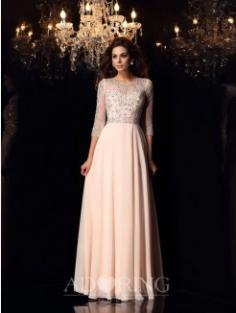 A-Line Scoop Chiffon 3/4 Sleeves Beading Floor-Length Dresses