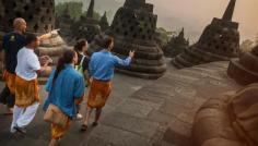 Travellers walking through Yogyakarta Borobodur Temple in Java, Indonesia
