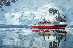 The G Expedition ship sailing past a snowy mountain in Antarctica