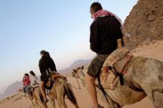 Tourists camel riding in the dry valley of Wadi Rum, Jordan