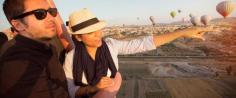 Couple on a hot-air balloon looking out upon the volcanic valley of Cappadocia, Turkey