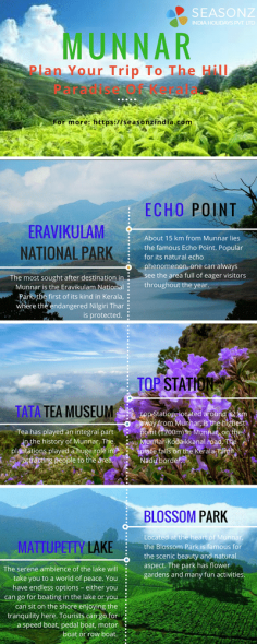 Munnar sightseeing includes Mattupetty Dam where you can enjoy speed boating services. Echo point, the silent valley where one can hear their voices as an echo. Best time to visit top stations is on the morning where you can see the clinging clouds over the misty mountains. Blossom Park and Mattupetty lakes are the other prominent destinations in Munnar.