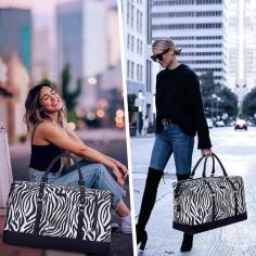 This designer overnight bag for women is made of high quality water resistant canvas and PU leather, tear-resistant and easy to clean. The irregular zebra stripe and retro metal accessories of the womens weekend bag make it more stylish and unique. Double zippers are convenient to get what you want. Padded handles are friendly to your hands.