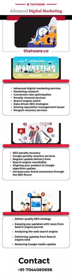 Take your marketing to new heights! Learn how our best advanced digital marketing agency can significantly boost your leads, traffic, and income! Using Google search and innovative social media marketing, you can significantly increase your leads, traffic, and money. We use your brand and cutting-edge Google AI technology to produce relevant keyword-rich search and product advertisements. To turn viewer interest into income, our one-of-a-kind digital marketing agency employs multimedia that is rich in brand personality. Visit ThatWare today! For more info visit here: https://thatware.co/digital-marketing-services