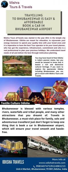 Find professionally authorized, fully trained, and gracious drivers for your soothing journey in the temple city, when you book a car in Bhubaneswar Airport from Mishra Tours & Travels. With day-and-night service, they offer ergonomic traveling solutions in their luxury rental cars in various tourist stopovers in Odisha and neighboring states.