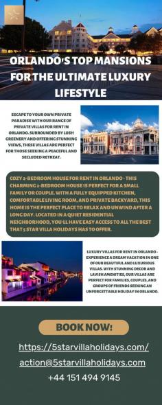 5 Star Villa Holidays provides these Orlando mansions, which offer a secluded escape from the hustle and bustle of the city. With sprawling grounds, private pools, and outdoor entertainment areas, these homes are perfect for those who value privacy and tranquility. Step inside and you'll find ample living space, high ceilings, and stunning architecture that will take your breath away.