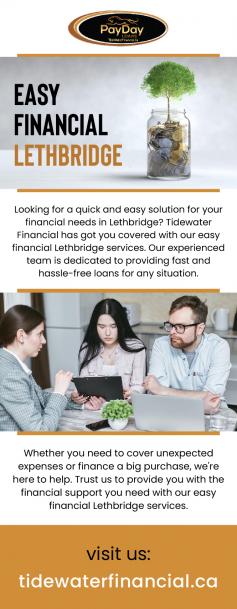 Tidewater Financial is your go-to source for easy financial assistance in Lethbridge. Whether you need a payday loan, installment loan, or line of credit, we have a variety of options to meet your needs. Our simple online application process and fast approval times make it easy to get the cash you need when you need it. Trust Tidewater Financial to help you get back on track with your finances.