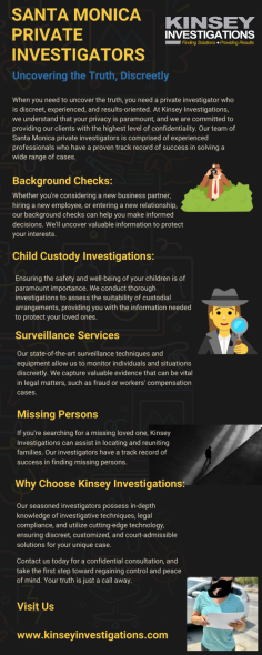 Need a reliable Santa Monica private investigator? Look no further than Kinsey Investigations. Our experienced team provides discreet and professional investigative services to help you uncover the truth. Contact us today for a confidential consultation.