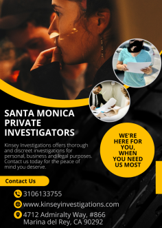 Are you looking for a reliable private investigator in Santa Monica? Then Kinsey Surveys is the right place for you! Thanks to our extensive experience and expertise, we offer high-quality investigative services tailored to your needs. Whether it's background checks, surveillance or missing person searches, we are here for you. Trust Kinsey Investigations to deliver reliable, discreet and timely results. Contact us today for a free consultation!