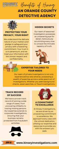 Are you trying to find a trustworthy and knowledgeable Orange County detective agency? For excellent investigative services, trust Kinsey Investigations! Our team of expert investigators focuses on obtaining vital evidence for business, personal and legal cases. Kinsey Investigations has a track record of success and is dedicated to the highest level of professionalism. You can rely on them to handle your case with accuracy, diligence, and confidentiality. For a consultation, please contact us right now!